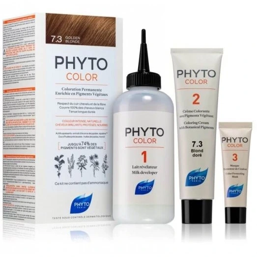 کیت رنگ مو فیتو رنگ بلوند طلایی (شماره 7.3) حجم 50 میلی لیتر، محصولی از کمپانی فیتو فرانسه است. این رنگ موها که با نام فیتوکالر شناخته می‌شوند با برترین تکنولوژی و بر پایه تازه‌ترین تحقیقات در زمینه گیاهان و خواص‌ آن‌ها و با بالاترین قدرت پوشانندگی موهای سفید تولید می‌شوند. رنگ موی فیتو حاوی درصد بالایی از عصاره گیاهان رنگی بوده (74 درصد ترکیبات محصول از عصاره گیاهان رنگی) و ترکیبات آن دارای مواد مرطوب کننده، ترمیم کننده و ضدالتهاب است. این محصول کاملا فاقد آمونیاک بوده و به این دلیل ضمن ایمن بودن و آسیب نرساندن به پوست سر، خطر آلرژی (حساسیت) به حداقل برسد. رنگ موی فیتو (Phytocolor Permanent Color)، حاوی ویتامین C به عنوان آنتی اکسیدان است و به دلیل وجود مواد پاک کننده پوست سر در ترکیبات این رنگ موها، پس از رنگ کردن مو با رنگ موی فیتو، نیازی به استفاده از شامپو برای شستشوی موها وجود ندارد