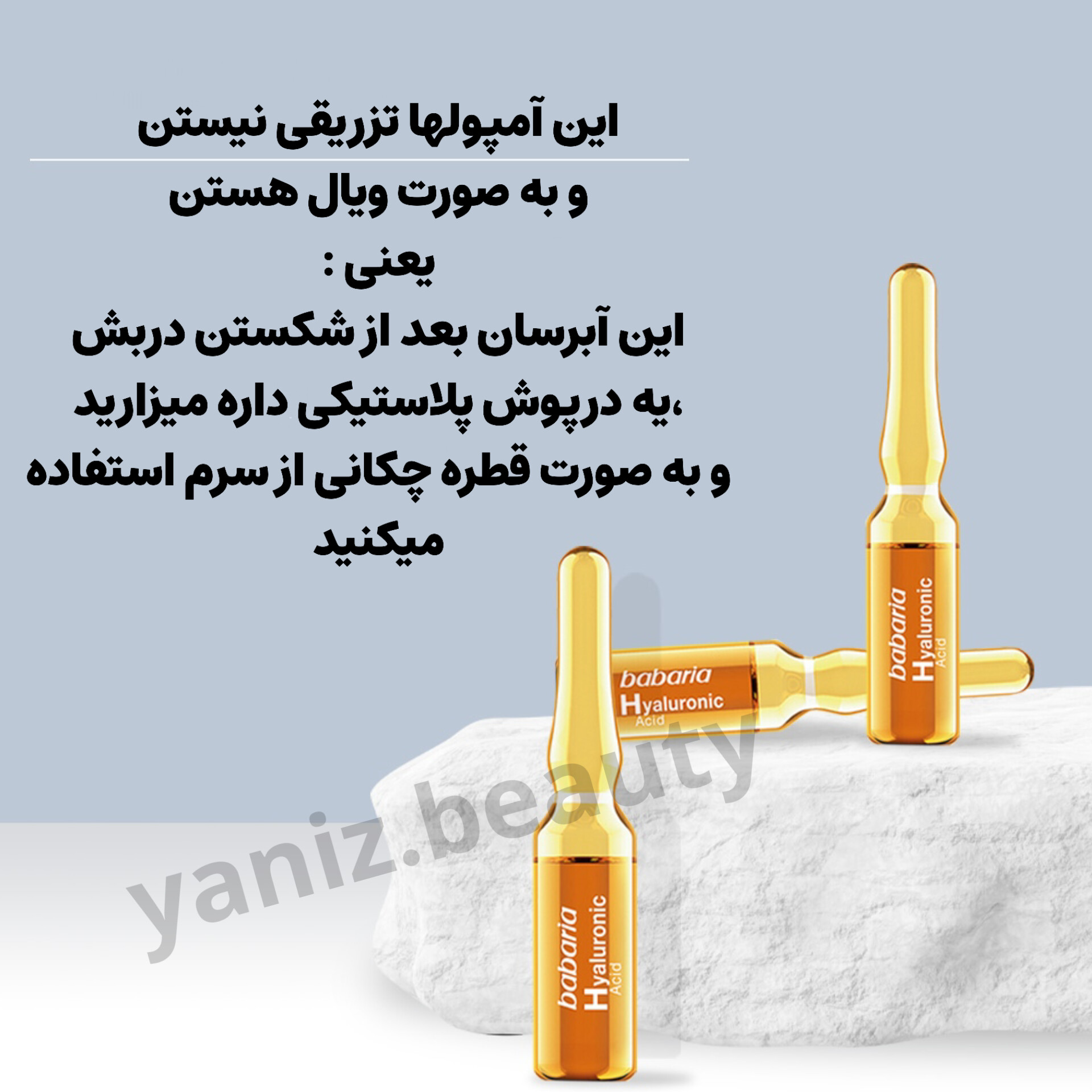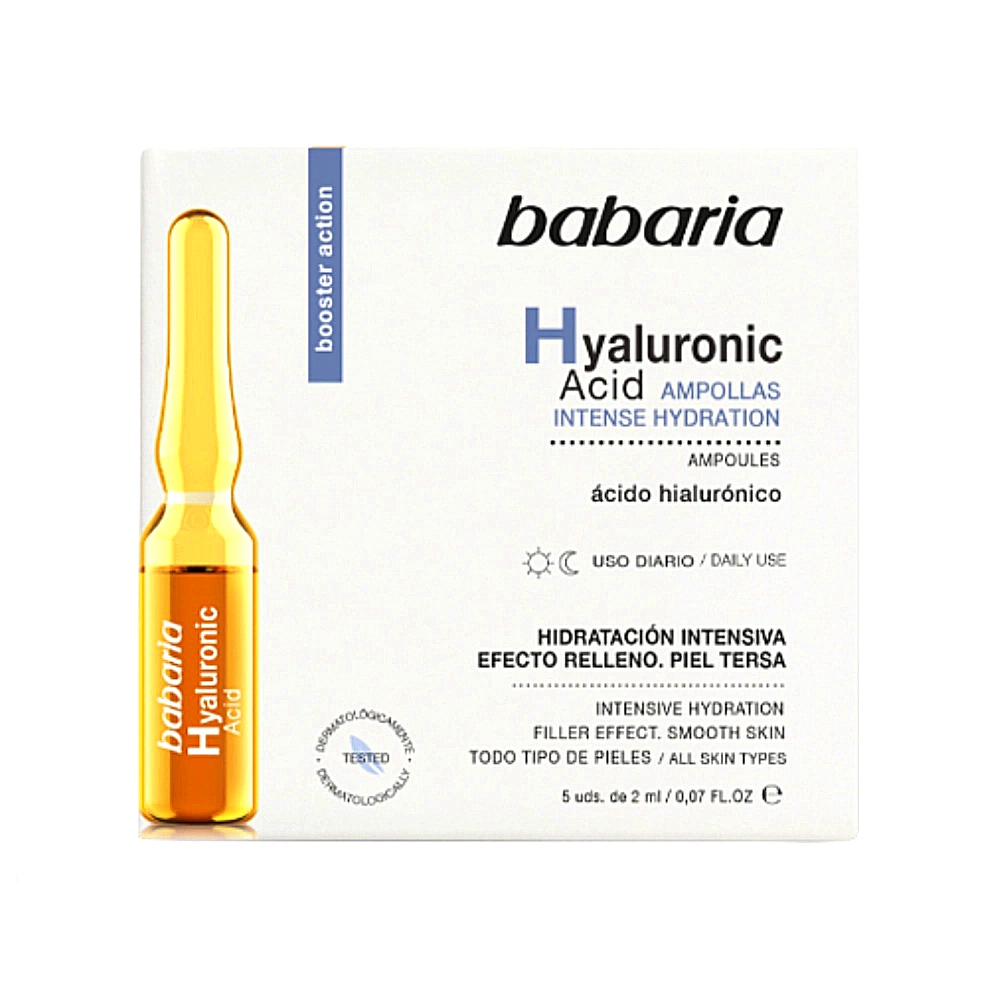 آمپول آبرسان هیالورونیک اسید باباریا Babaria از مقادیر بسیار بالای اسید هیالورونیک برخوردار است. به عمیق ترین لایه های پوست نفوذ کرده و پوست را با قدرت تمام آبرسانی کرده و رطوبت پوست را حفظ می کند. سطح اپیدرم پوست را تغذیه و تقویت می کند. از قابلیت فرم دهی به پوست برخوردار است و خاصیت ارتجاعی پوست را افزایش می بخشد. شاداب کننده و طراوت بخش پوست می باشد و در کاهش چین و چروک های پوستی نقش عمده ای دارد. پر کردن خطوط پوستی و جوانسازی پوست از هدایای ویال هیالورونیک اسید باباریا است. بافت بسیار سبک و زود جذبی دارد و تولید کلاژن را در پوست تحریک می کند. برای انواع پوست نیز قابل استفاده است.