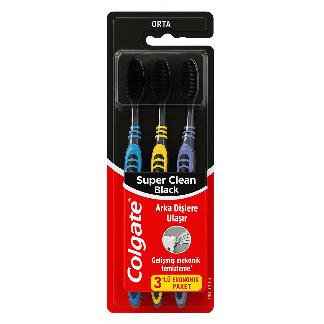 مسواك كلگيت مدل superclean black با برس نرم بسته 3 عددي