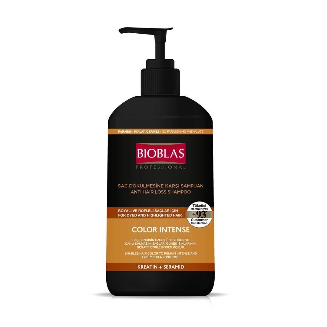 شامپو ضد ریزش مو بیوبلاس مشکی مدل COLOR INTENSE حجم 1000 میل مخصوص موهای رنگ شده است و با فرمولاسیون حاوی مواد گیاهی و بدون مواد نگهدارنده و پارابن، با مراقبت از فولیکول موها از ریزش آن ها جلوگیری می کند.